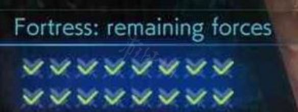最初只顯示11個圖標,有5個隱藏(3個旋轉門後面,2個在木塔里)。到要塞盡頭時如果還沒擊敗所有的敵人,會出現對話選項,選擇先把這里的敵人都幹掉就能繼續留在要塞中清理敵人,直到16個圖標全部打鉤。