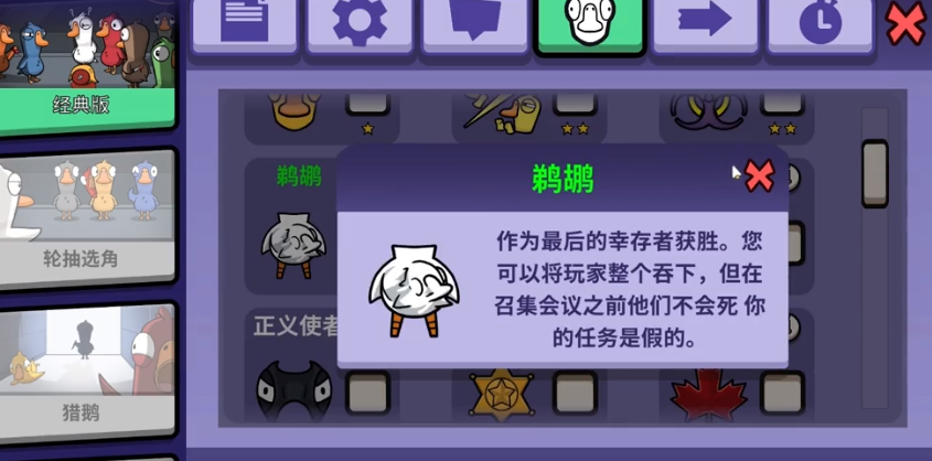 1、鵝個職業技能:作為最後的倖存者獲勝,你可以一口吃掉別的玩家,被吃掉的玩家在你肚子里可以說話,但是只有你能聽見,別人聽不見,吞人無上限,被吃玩家可以在你的肚子里交流。