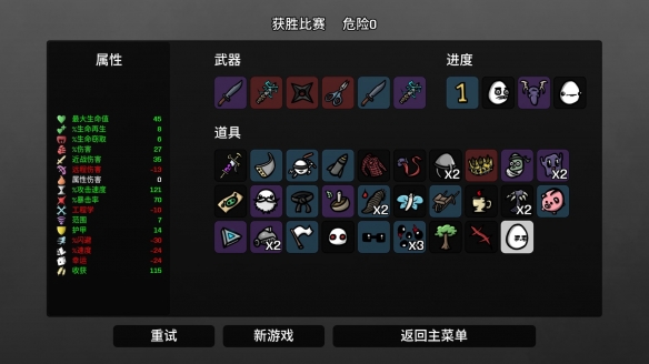 屬性,由於有噴火器高頻率的傷害,所以靠生命偷取來回血,生命再生可以不點,護甲點5到7就行,閃避30以上,運氣前期可以升一升,提高各方面的概率,收穫有合適的道具也能拿,其他就是堆血量和屬性傷害。