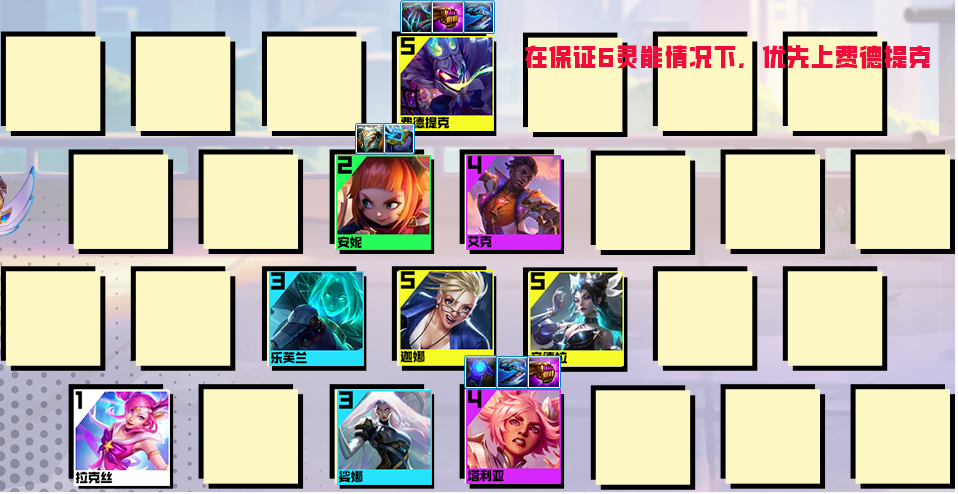 如果沒有迦娜,則直接開5星守4靈能羈絆。5星守能夠給塔莉婭提升法力值回復,儘可能讓塔莉婭快啟動,有辛德拉就上辛德拉,沒有則上芮爾開5星守。