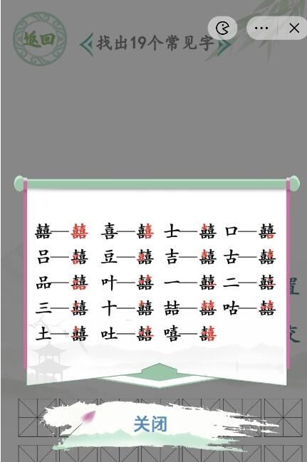 俺找出17個字是《漢字找茬王》最新找字關卡,那麼囍找出19個字怎麼過?答案包含:囍、喜、士、口、呂、豆、吉、古、品、葉、一、二、三、十、喆、咕、土、吐、嘻。下面是小編給大家帶來的抖音小游戲《漢字找茬王》囍找出19個字通關攻略,不清楚如何過關的小夥伴們一起來看看吧。