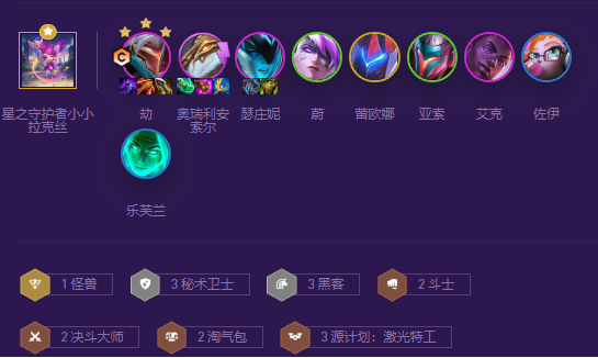 開始換陣推薦陣容:豬妹、亞索、劫、龍王、佐伊、妖姬。蔚D出基礎卡兩星,一星劫一星龍王就能鎖血升8.5階段升8人口補個艾克開2淘氣包2秘術。如果風女效果是加攻擊力,也可以下掉蔚換風女抱團吃buff在8人口大D陣容兩星。
