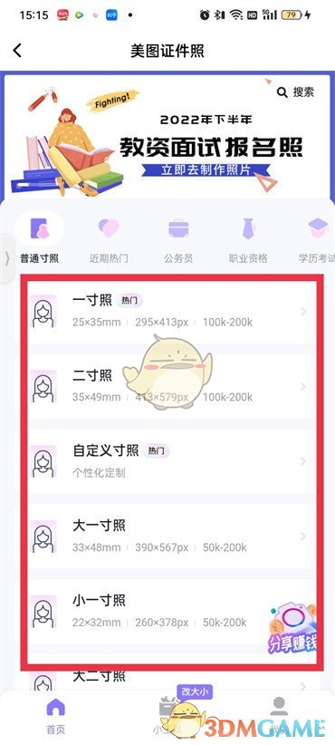 2、進入到證件照頁面之後點擊一個自己需要的尺寸;