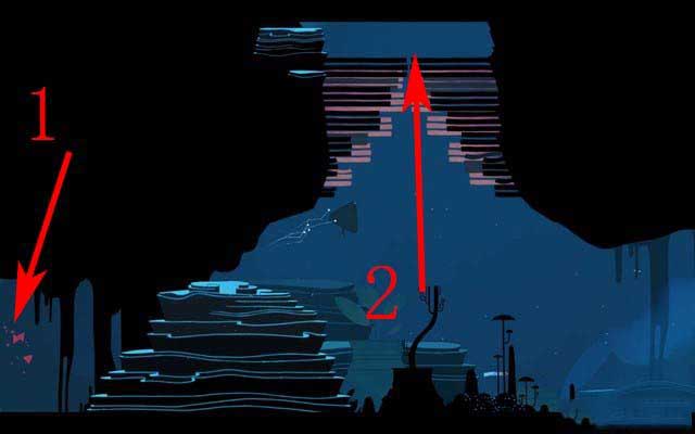 獲得寶石之後,往左邊游,如下圖箭頭1所指的地方是一個隱藏的可以跟隨你的花叢,