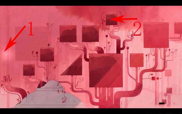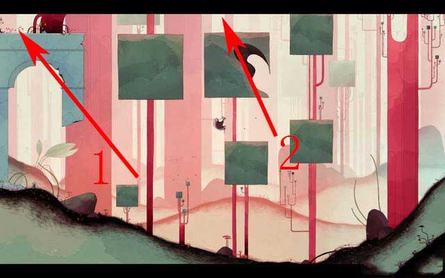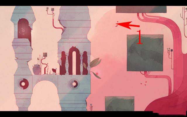 這里有一個寶石,獲得的方法是飛到如下圖箭頭1所指的花叢那,利用花叢再次飛行(期間要往左邊飛)。