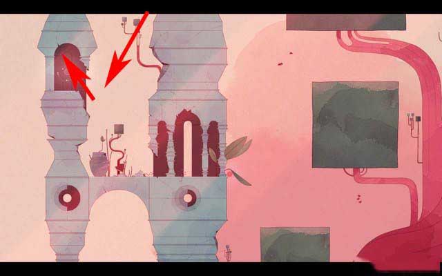 去左邊或者右邊都行,擊碎罐子,利用花叢飛上去之後,在利用最上面中間的雕像那裡的花叢飛上去。