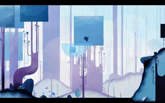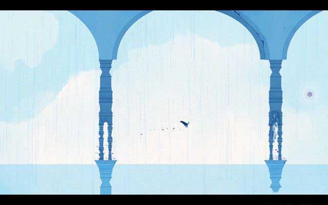 擊傷巨鳥之後,來到雕像處,使用你的神秘力量,降下雨水,頓時整個畫面變成了藍色。