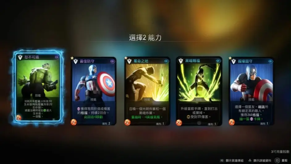 玩家通過打出不同的卡牌來獲得或消耗英雄氣概,而這個英雄氣概起到的作用也不只是一個怒氣槽,他還可以消耗以利用場景中的元素去參與戰鬥,比如搬起地下一個箱子去砸向敵人,而搬箱子砸敵人的過程也非常有該英雄的特色:奇異博士會用魔法來將箱子扔向敵人,擅長空間傳送的秘客則用靈魂劍割開空間,將箱子傳送到敵人頭上,傳統力量型的美國隊長則是用傳統的辦法搬起箱子砸向敵人。