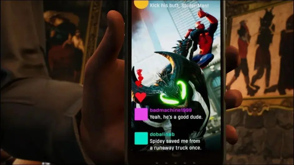 例如我們要擊敗毒液,則不得不求得它的死對頭蜘蛛俠的幫助,只有蜘蛛俠才知道毒液的弱點是聲波與火焰,而該章節最終戰也是在一個有大鐘的教堂,通過蜘蛛俠與「鍾」這一元素交互最終制服毒液,而不僅僅是擊敗對方復數血條這種勝利方式。