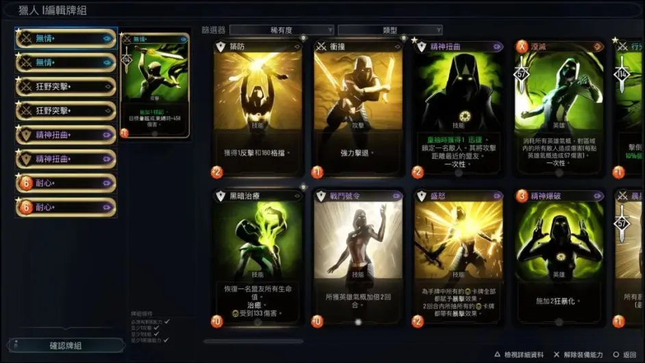 英雄戰鬥的卡組則必須要帶滿八張,每種卡牌數量不得超過兩張,且卡牌按種類(戰鬥、策略和英雄)必須每種帶上一張且每種不超過四張,這也導致玩家可以做的選擇其實是相當有限的。