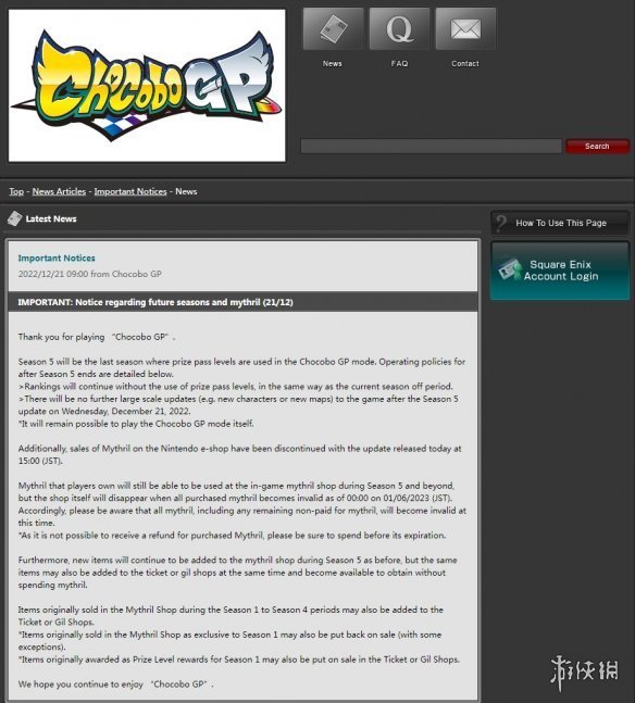 《陸行鳥GP》的高級游戲貨幣秘銀將不再出售。已經購買的玩家可以在1月6日之前,在游戲內商店使用剩餘秘銀購買商品,屆時商店將消失並且所有秘銀都將失效。