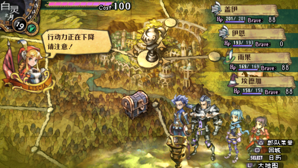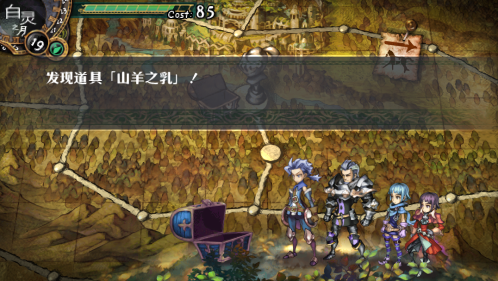 出城後進入大地圖,像下棋一樣在場景前進,會有直線和岔路,地圖上除了隨機怪物,還有強力的BOSS。冒險的限制主要是Cast,每進行一步就消耗一個行動力,歸零之後強制回城。