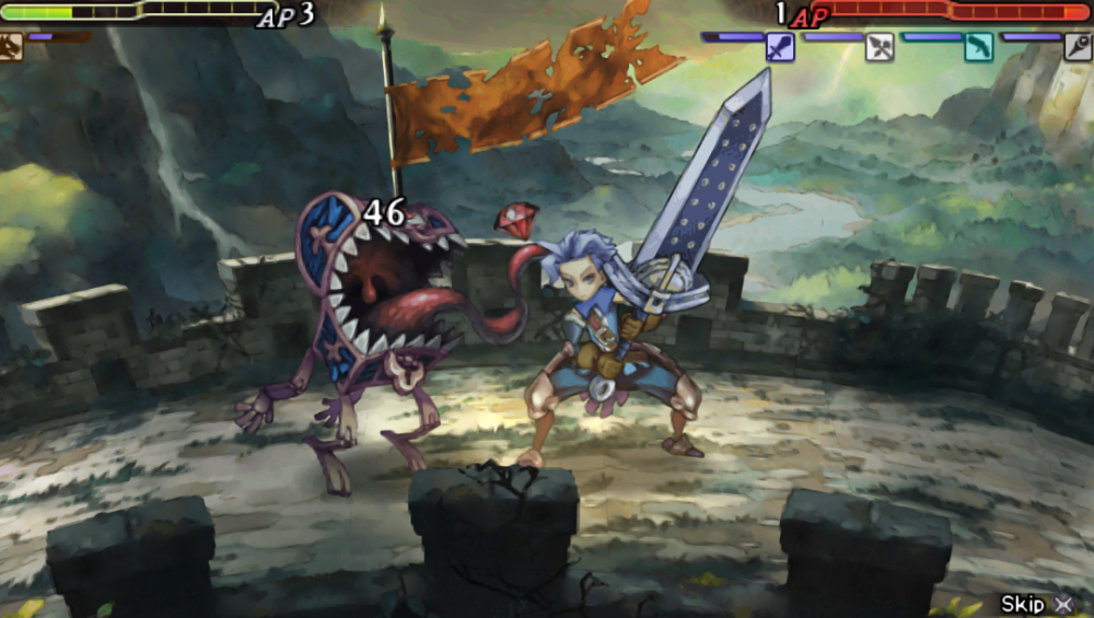地面是獨特的弧形設計,每回合會轉換場景,給人以不斷前進的感覺。角色還有勇氣設計,戰鬥失敗後不會死亡,HP戰後恢復到1但勇氣會歸零,戰鬥力大幅下降。