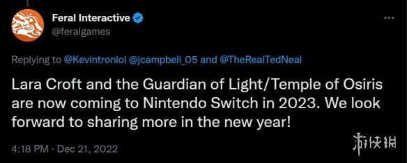 負責移植工作的Feral Interactive在推特上表示,《勞拉與光之守護者》《勞拉和奧西里斯神廟》目前計劃於2023年登陸任天堂Switch平台。明年他們會分享更多消息。看來NS玩家還得再等一陣子了。