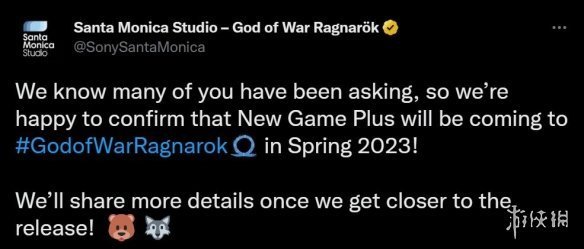 「我們知道你們很多人都在問,所以我們很高興確認:新遊戲+模式將在2023年春天加入《戰神:諸神黃昏》!我們會在臨近上線日期的時候分享更多信息。」