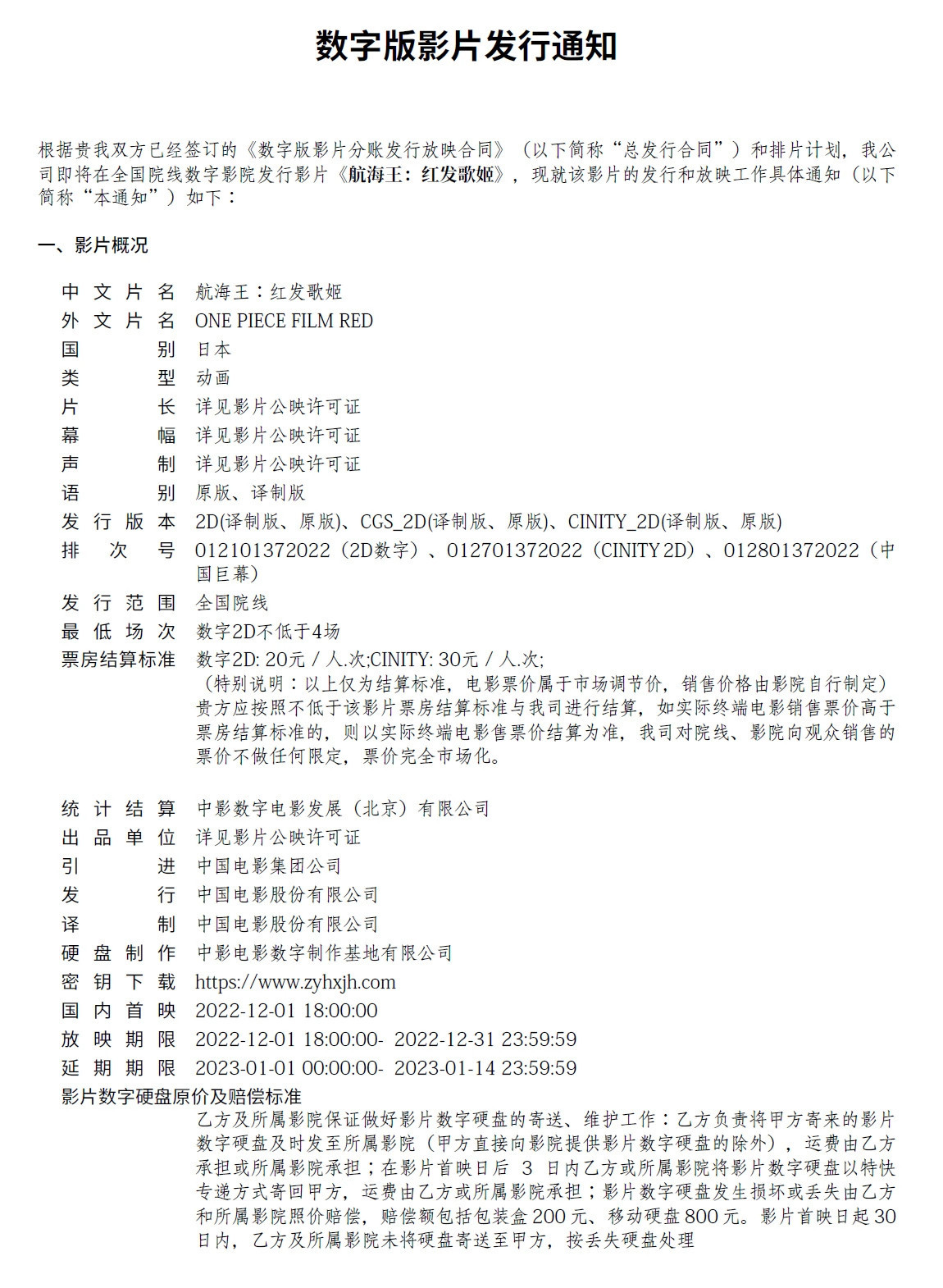 據IT之家報道,電影《航海王:紅發歌姬》宣布將延長上映至2023年1月14日,本片於12月1日上映。據悉,《航海王:紅發歌姬》是東映動畫製作的動畫電影,由谷口悟朗執導、黑岩勉任編劇,於2022年8月6日在日本上映,2022年12月1日在中國大陸上映。
