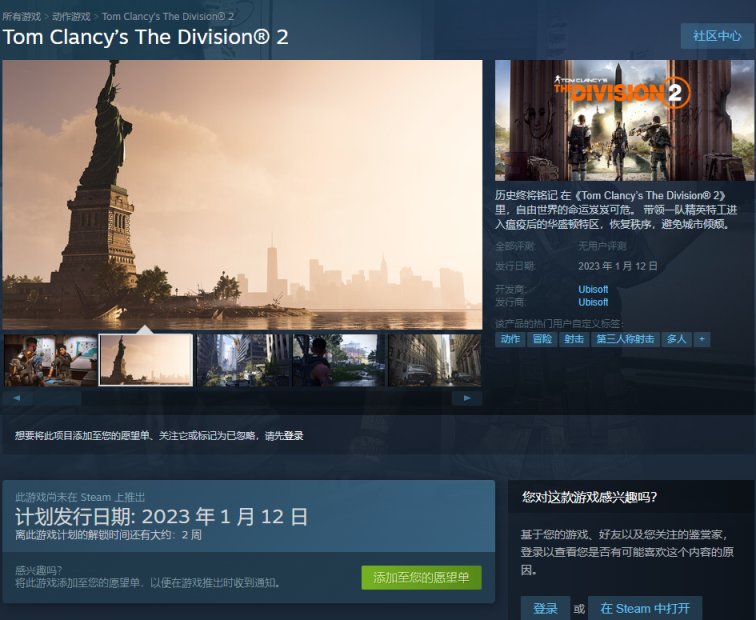 育碧旗下湯姆克蘭西系列《全境封鎖2》現已重新上線 Steam 商城,將於2023年1月12日發售,支持中文: