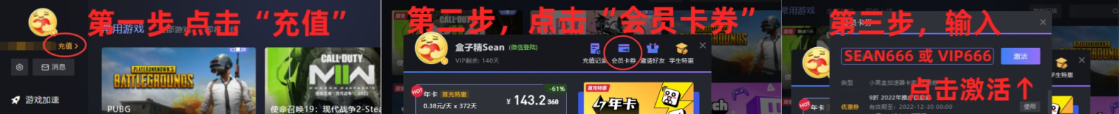 小黑盒游戲加速器免費使用啦!Epic、Steam 商店打不開,無法連接等網路問題一鍵解決!下載器小黑盒加速器客戶端,點擊頭像→會員卡券→輸入 VIP666,點擊激活後就可以領取加速器免費時長啦!