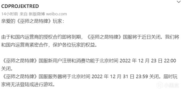 昨日深夜,巫師3官方CDPR發布了一則關服公告。該公告稱:「由於和國內運營商的授權合約即將到期,《巫師之昆特牌》國服將於近日關閉。《巫師之昆特牌》國服伺服器將於北京時間 2022 年 12 月 31 日 23:59 關閉。屆時玩家將無法登陸或進行遊戲。」