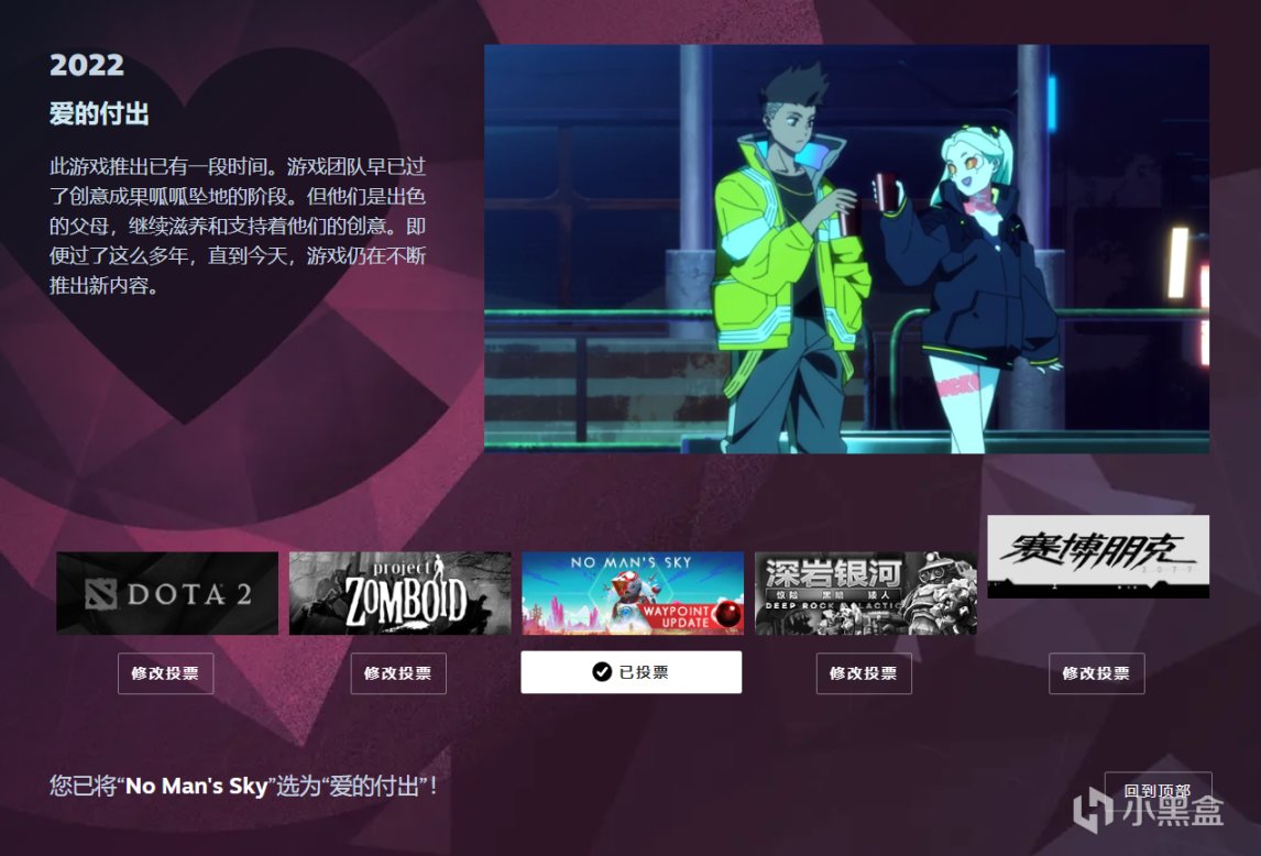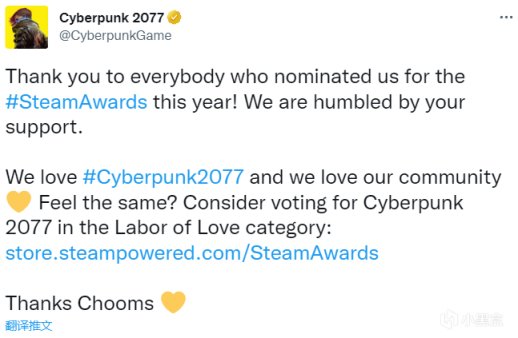 感謝今年提名我們參加Steam大獎的所有人!我們對您的支持感到愧不敢當。我們熱愛《賽博朋克2077》,熱愛我們的社區,有同樣的感覺嗎?考慮在「愛的付出」類別中為《賽博朋克2077》投票地址:https://store.steampowered.com/SteamAwards
