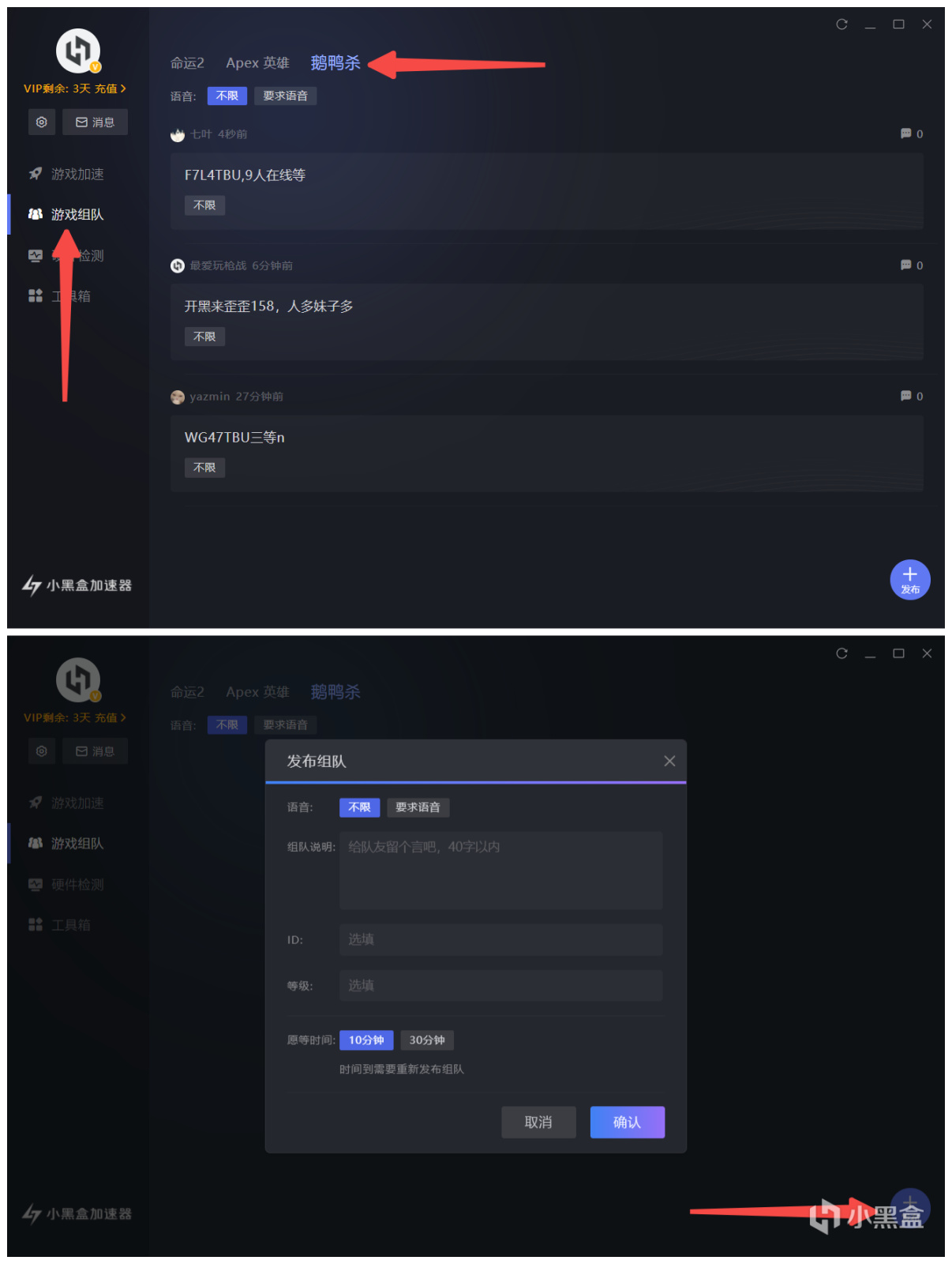小黑盒組隊功能自上線起就受到了眾多盒友的支持,許多APEX與命運2的玩家都在組隊功能中尋找到了志同道合的盒友。而近來,相信大家也都注意到了在主播與玩家中掀起的「鵝鴨殺熱潮」。為了方便廣大盒友尋找隊友一同遊玩,鵝鴨殺社區組隊功能正式上線!同時在小黑盒加速器PC端中也上線了該功能,玩家可在加速器中直接尋找隊友或發布組隊。還在等什麼,快叫上好友上線鴨!