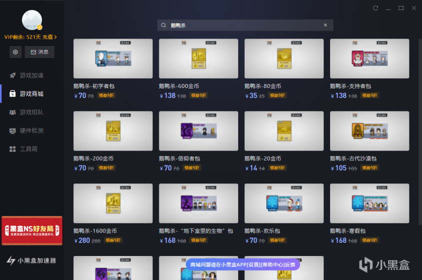 為了滿足廣大盒友在「鵝鴨殺熱潮」下的加速需求,小黑盒加速器與遊戲官方合作,開展了為期7天的限免加速活動,在活動期間PC端的鵝鴨殺加速完全免費!同時也可以在黑盒商城中購買官方授權的遊戲金幣與外觀皮膚包噢~詳情請見圖。