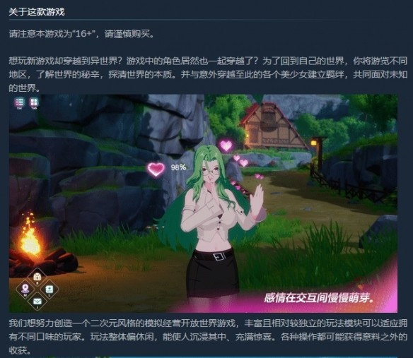 盡管遊戲素質不盡人意,比如雖然採用了Galgame的遊戲模式,但白開水般的劇情重複單調,部分貼圖UI粗糙,人物比例失調;而所謂的福利內容也不盡如人意,全遊戲尺度最大的圖,就是商店頁面展示的那些,需要額外打補丁才能解鎖澀澀內容。