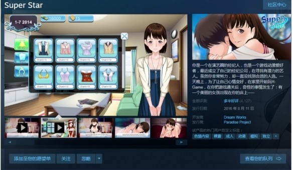 於是,他們通過旗下「成都愛相隨科技公司」改頭換面,成了Steam獨立黃油廠商「Sakura Game」。改名後不久,SakuraGame就在Steam上推出了他們開發的第一款黃油《Superstar》。