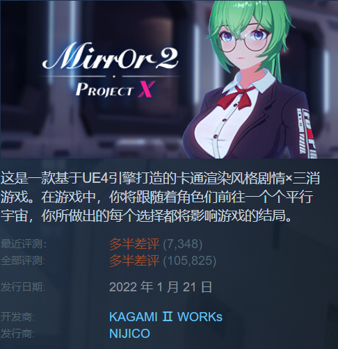 等到今年《Mirror2:Project X》上線時,發行商便換成了NIJICO。「Mirror 2」風波過後不久,NIJICO最終也被換成了「Nova Studio「。 不得不說,在賽博仙人跳引起玩家們的激烈反噬後,他們開始了換皮的行動,屬實是故技重施了。