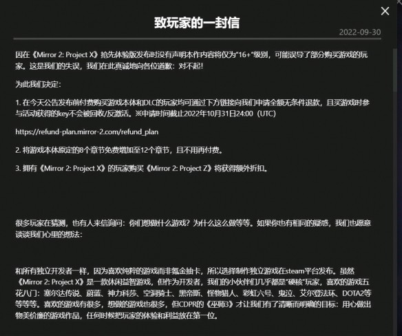 玩家們的猜想最終應驗,最糟糕的情況也確實發生了。在9月30日,官方突然宣布把《Mirror 2》的遊戲分級正式定為「16+」,讓玩家們猝不及防。