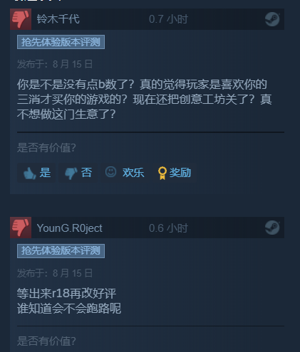 被「背刺」的玩家們感到出離的憤怒,他們成群結隊地去steam平台的評論區里打上一份差評;而先給點澀澀的希望,再用「16+」的大棒把玩家嚇退的行為也被網友們描述為「賽博仙人跳」;