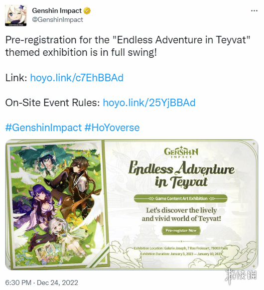 該藝術展將於1月3日在巴黎市中心瑪黑區約瑟夫藝廊舉辦。該活動持續一整周,以《原神》的官方藝術作為展覽的主要內容。觀看展覽的玩家們可以在 TikTok 和米游社等平台上上傳活動照片和視頻,參與者將有機會贏得各種獎勵,包括獨家明信片、原石和角色周邊等。