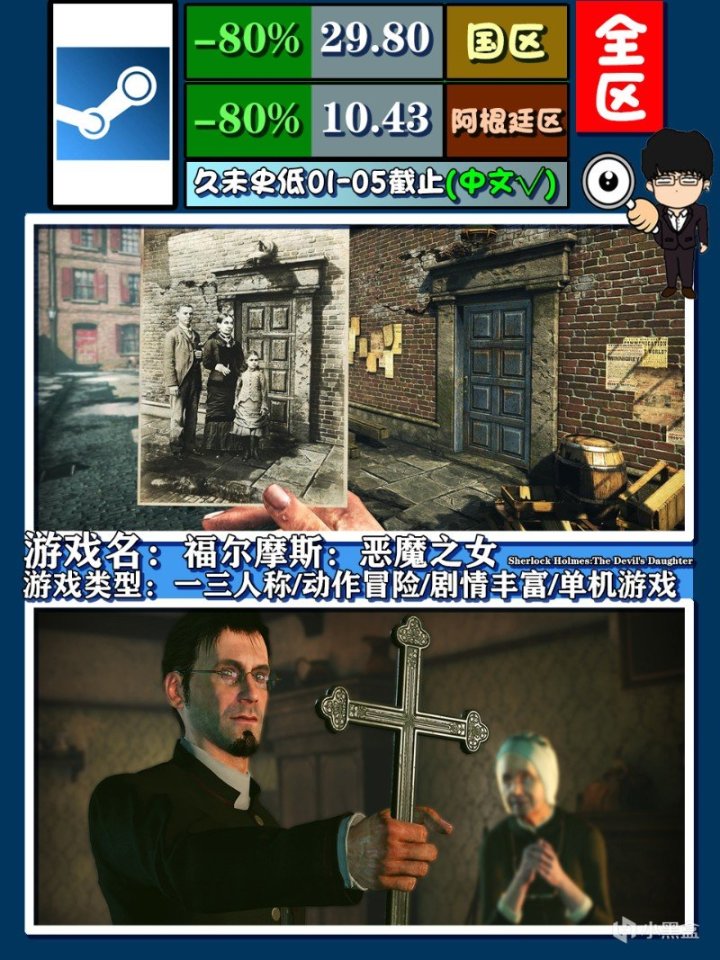 《福爾摩斯:惡魔之女》,對於這個系列說實話老基德只能說是又愛又恨,愛是對推理題材,恨是對游戲優化,此次推薦這款的理由是多年保持的打折價位,距離上次史低已過了一年半,估計要再次史低的可能性也比較低了