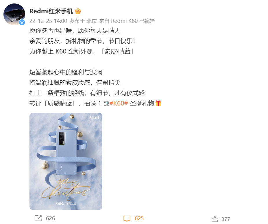 Redmi 紅米手機官方今日下午公布了 Redmi K60 全新外觀「素皮・晴藍」的官方渲染圖。
