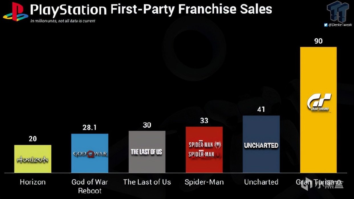 1.《GT賽車》系列 - 9000萬份2.《神秘海域》系列 - 4100萬3.《漫威蜘蛛俠》系列(包括《蜘蛛俠:邁爾斯·莫拉萊斯》)- 3300萬份4.《最後生還者》系列 - 3000萬份5.《戰神》系列(重啟後) - 2810萬份6.《地平線》系列(不包括《地平線:西之絕境》)- 2000萬份+
