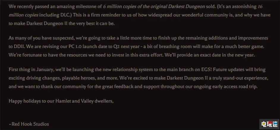 Red Hook表示正如玩家們所推測的那樣,他們確實需要更多的時間來完成對《暗黑地牢2》的內容添加與相對應的改進工作。將發售日從2023年2月改到第三季能夠讓他們有更多的時間來將游戲變得更好。對於具體計劃,官方表示將在2023年1月推出遊戲中一直令人詬病的角色關系系統的大改更新,同時未來還將推出更多的可玩英雄角色改善遊玩體驗。