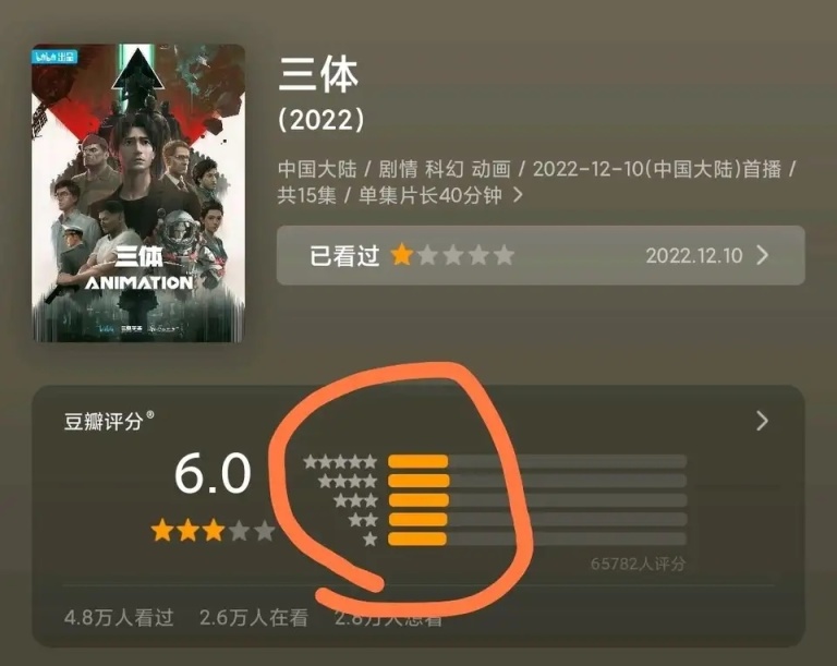 但是《三體》畢竟是《三體》,作為科幻作品自然是不能用常理來看待。可能是目前唯一一部最奇葩的動畫。三體的評分一星二星三星四星的人數竟然達到了一致。