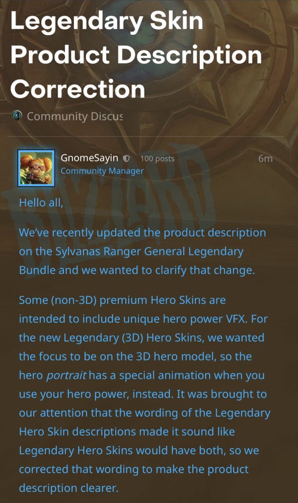 由於舊版描述的原因,玩家以為傳奇皮膚會包含專屬的英雄技能動畫,而實際情況並非如此,跟普通皮膚一樣。激起玩家憤怒的,是暴雪偷偷更改了商店的禮包描述,卻沒有發布公告,而很多人就是看了舊版的宣傳,才上當買了這些皮膚,畢竟一個就賣25美元。