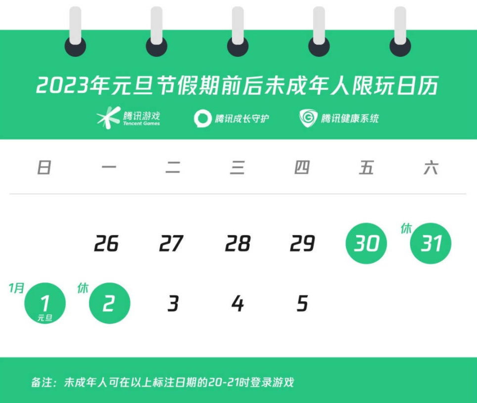 在12月30日-1月2日(周五及元旦節假期)每日的20時至21時之間,未成年人可登錄遊戲。其餘工作日,均為禁玩時段