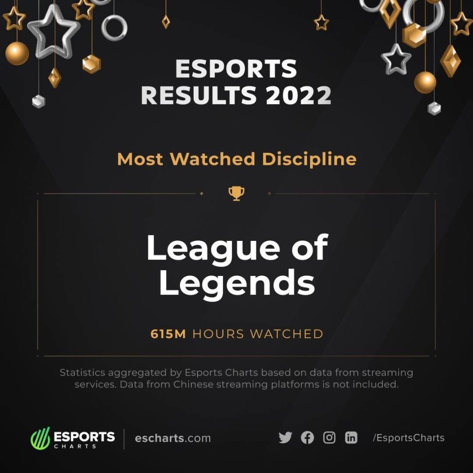 根據數據分析機構Esports Charts的消息顯示,《英雄聯盟》成為2022年收視率最高電競遊戲。該遊戲直播總觀看時長超過6.15億個小時,其中2022世界總決賽也是年度收視率最高的電子競技賽事,累計觀看直播1.42億小時