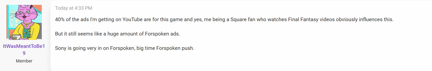 Reddit網友反映,他在Youtube上收到的廣告中有40%是關於Square Enix的新游戲《Forspoken》的,索尼似乎在全力以赴的對這款游戲進行宣發。而也有評論表示,SE和索尼就《Forspoken》這款游戲簽署了為期兩年的主機獨占合約,自然要大力宣發這款游戲。