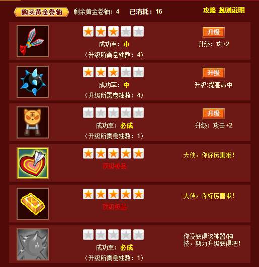 我記得很久之前,光是武器強化下面就已經有了好幾個子系統——玩家可以用黃金捲軸去提升武器的星級,許多武器到達3星和5星時不但外形上會產生變化,能力也會產生質變成為「真·XXX」武器。