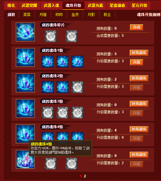 我們還可以在武器上鑲嵌魂珠,提供強大的屬性增益,那時候的魂珠還分為5個等級,每2-6個不等次級魂珠就能合成一個更高級的,越高級的魂珠成功合成概率越低,越高級的魂珠合成失敗還會有概率降級。
