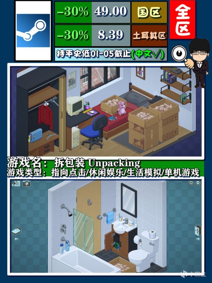 《拆包裝》,非常適合喜歡現實收納的玩家朋友們入手,治癒的畫風下輕松遊玩可以好好享受4個小時以上,特別適合晚上一個人靜下心來慢慢遊玩
