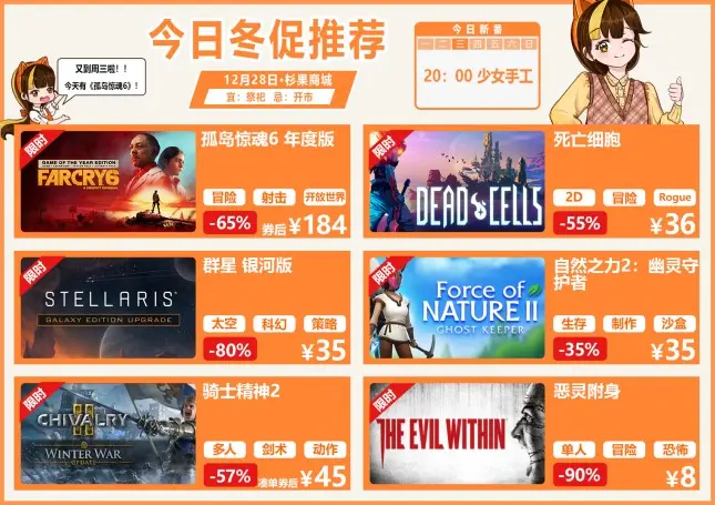 杉果冬季特惠活動正在進行中,全場數千款遊戲集體平史低,疊加滿減券後輕松擊穿 Steam 史低!每日 24 小時限時折扣更是不容錯過,超值折扣不必擔心背刺。是不是已經怦然心動?那還等什麼,快來杉果杉果冬季特惠看看吧!