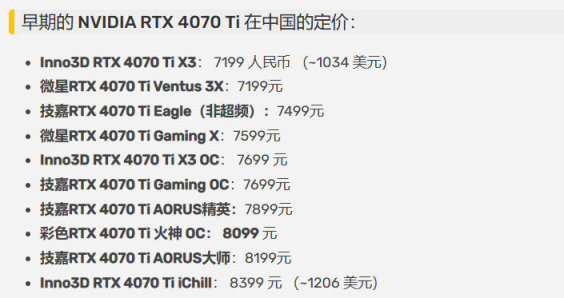 而從上架預售的情況來看,RTX 4070Ti的丐版價格,大致是定在了7199元,但頂級非公的話,幾乎都在8000元往上。