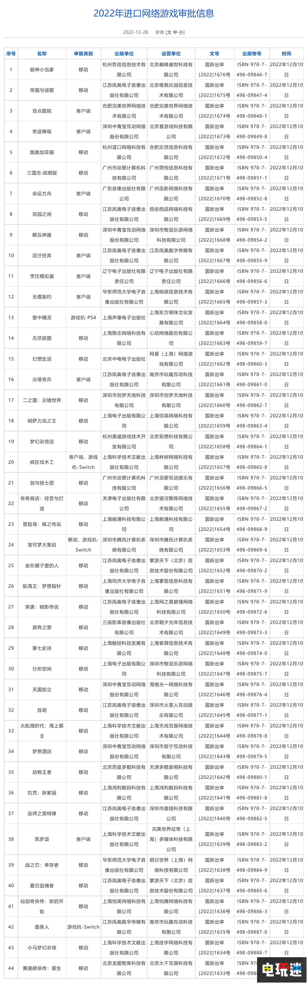本次公布的版號中,包括了《二之國:交錯世界》、《大航海時代:海上霸主》、《饑荒:新家園》這樣的衍生手游,當然除了一眾手游之外,還有著同時登陸Switch的寶可夢MOBA《寶可夢 大集結》、索尼第一方的《壁中精靈》、經營模擬遊戲《雙點醫院》以及MMO《命運方舟》(失落的方舟)與熱門FPS《無畏契約》。其中也有比較微妙的《巫師之昆特牌》,在拿到版號之前,CDPR就已經宣布《巫師之昆特牌》將在2023年停止更新,開發團隊開始將精力投入到下一部作品上了。
