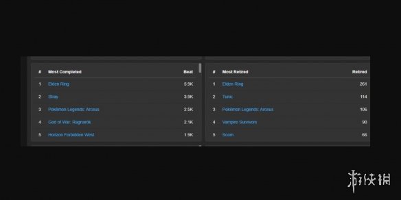 據HowLongToBeat.com的數據顯示,《艾爾登法環》是2022年通關率最高的遊戲,通關率第二高的遊戲則是賽博風格貓貓探險遊戲《Stray》,第三名是《寶可夢傳說:阿爾宙斯》。