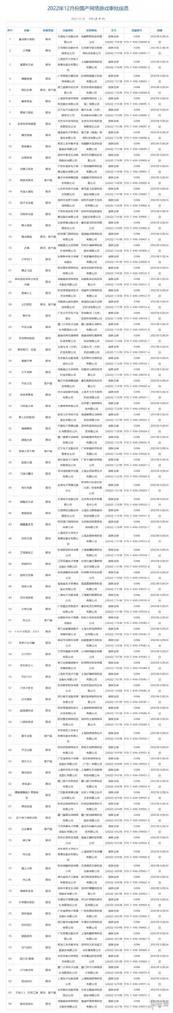 國家新聞出版署公布了2022年12月國產網路遊戲審批版號名單,共84個遊戲過審,包含多款客戶端遊戲和雙端遊戲。完整榜單如下: