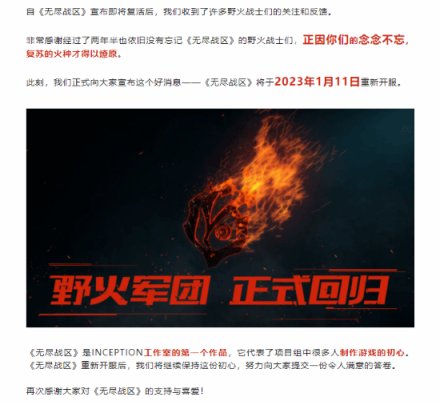網易官方宣布,曾於兩年停運的《無盡戰區》將於2023年1月11日重新開服: